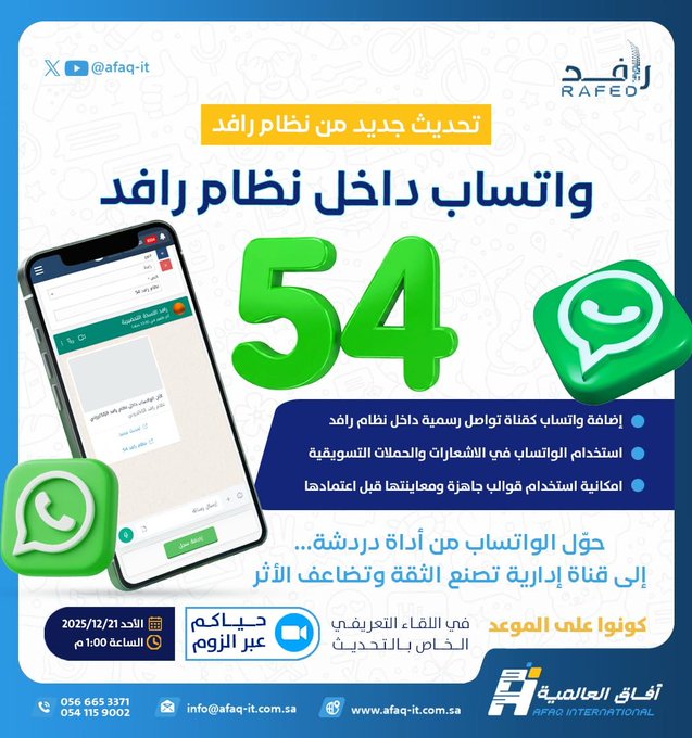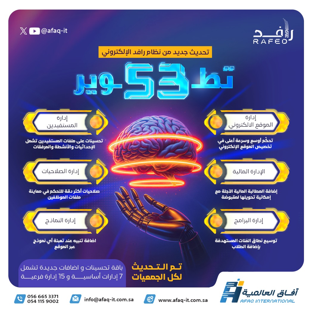 فى الأونة الأخيرة اعتمد كثير من الجمعيات نظام رافد الذى يعد نقطة تحول فى الميدان الخيرى حيث هو لبنة مهمة جدا فى تاريخ التحول التقنى إذ يعتمد على فريق دعم محترم يقدم أفضل الحلول ومخططات سير العمليات وتوزيع المهام واعتمادها وهى التى من خلالها استطعنا تحقيق نجاحات متميزة فى الموارد المالية وفى إدارة الخدمة المجتمعية وفى ضبط إدارة الموارد البشرية وتنظيمها.